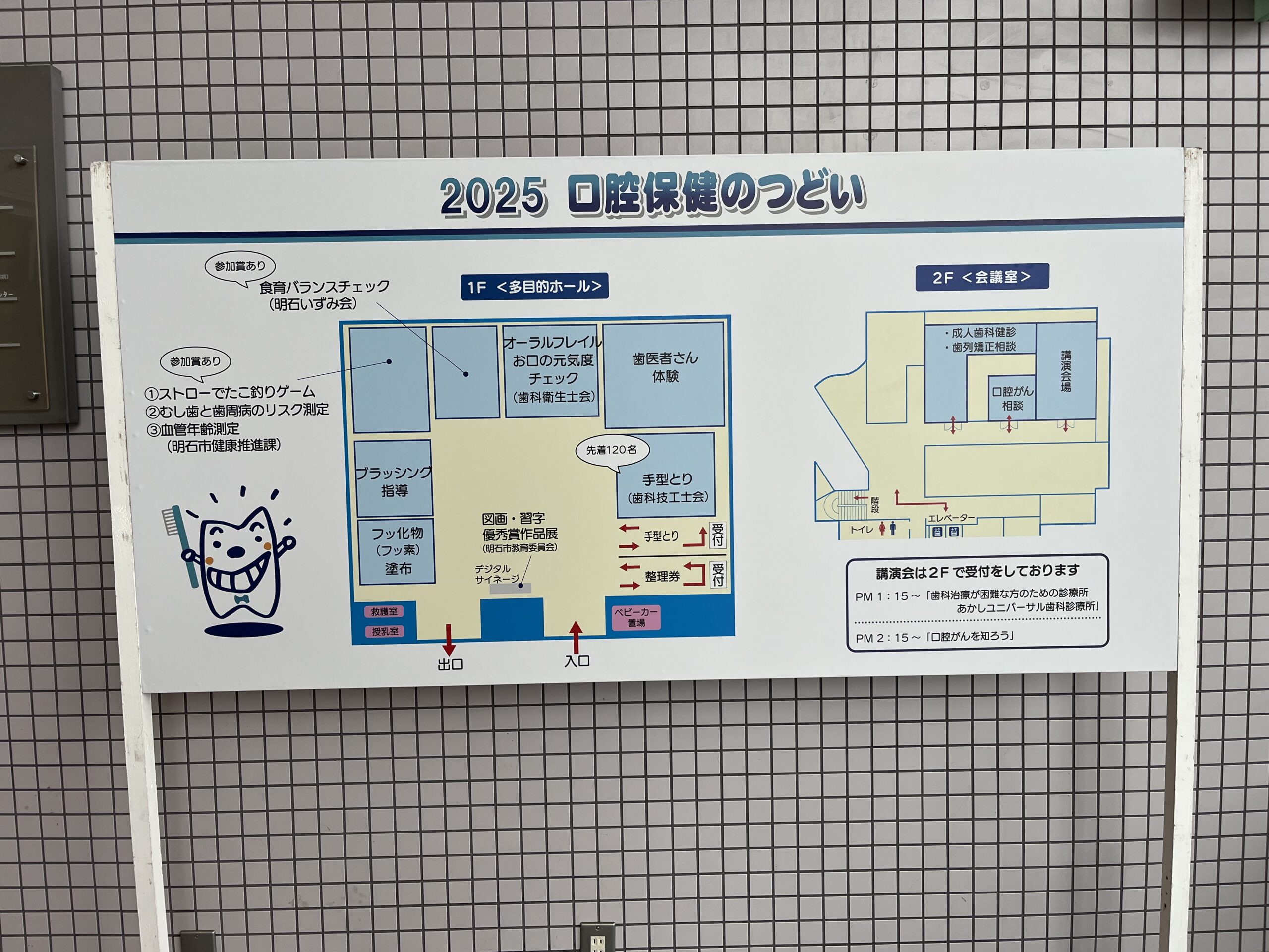2025年11月9日 明石市歯科医師会主催「口腔保険のつどい」に兵庫県歯科技工士会として参加協力してきました。開催場所はJR大久保駅西南、あかし保健所です。テーマとしては「お口から元気を育てよう」、お子様向けにブラッシング指導、フッ素塗布、歯医者さん体験 ストロータコ釣りゲーム(明石市健康推進課)食育バランスチェック(明石いずみの会)、図画.習字の優秀賞作品展(明石市教育委員会)そして兵庫県歯科技工士会として「手形取り」を参加協力してきました。先着120名と謳っていましたが足元が緩いにもかかわらず133名のお子様(多少親御さん)の型取りを致しました、参加協力の技工士会員非会員様お疲れさまでした。
